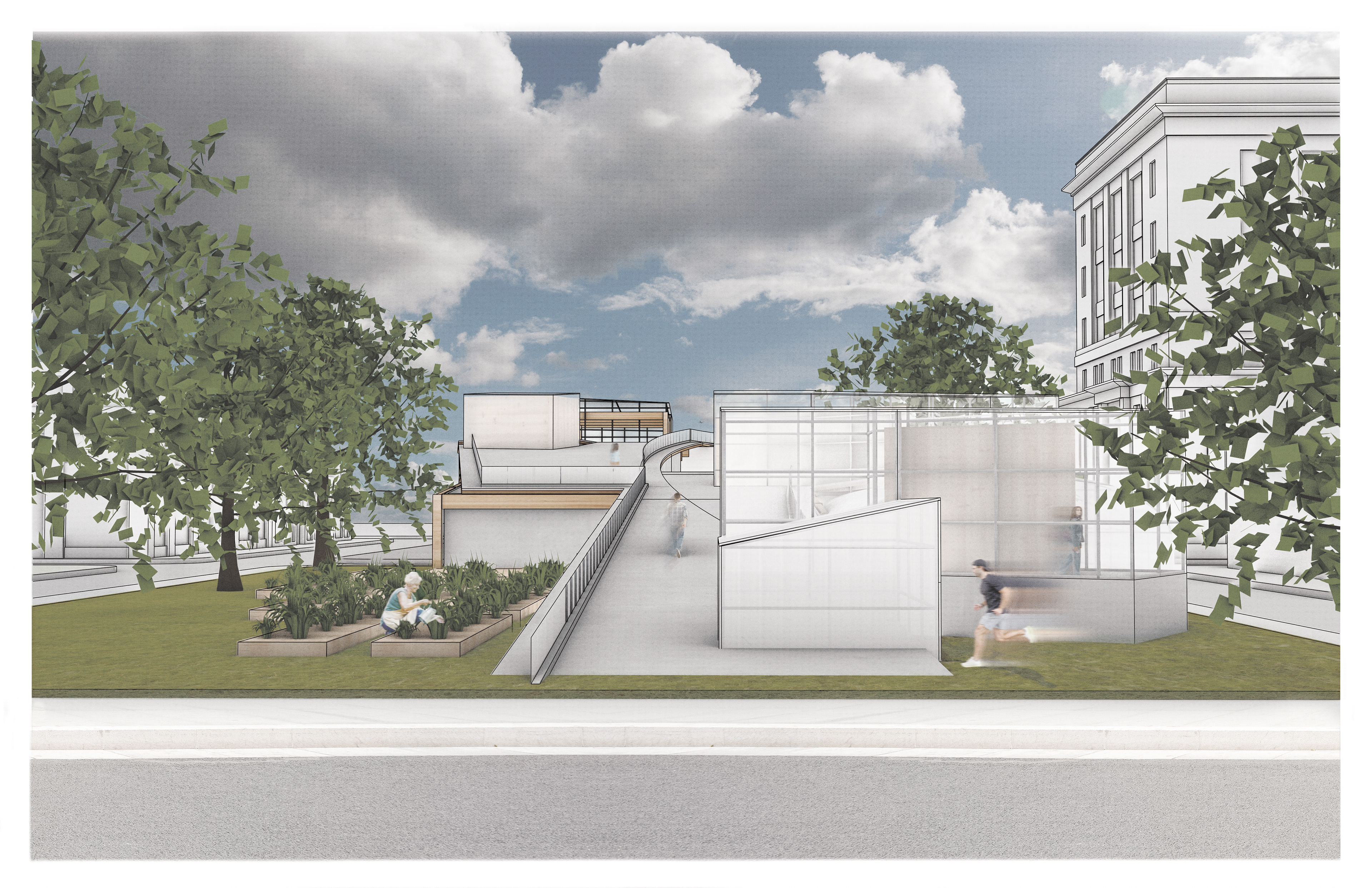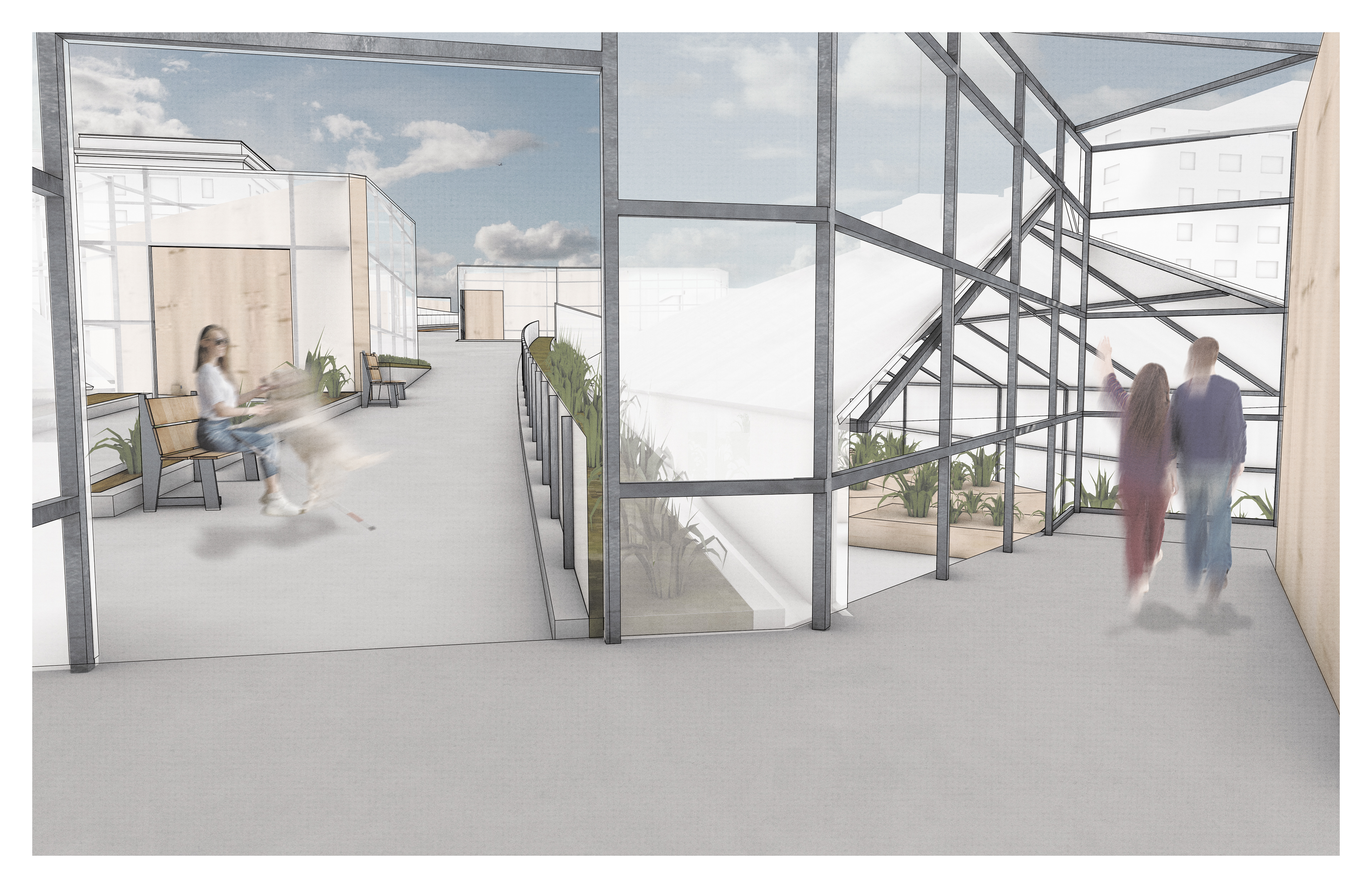 City Living comes with many benefits including access to plentiful restaurants of all sizes, costs, and freshness. While reliable and convenient, many residents will never question where their food is coming from or experience a farm's unique infrastructure. Bridge Insight seeks to reinvent how people experience their meals by contrasting the linear experience of drive through restaurants and grocery store checkout lines with the necessary food processes that are hidden far away from consumers. Through its elongated form, Bridge Insight also connects its neighboring green spaces with ramps that allow bikers and pedestrians to interact with each other and the food process at the same time.